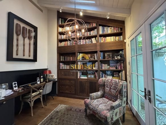 A charming TV area + home office nook with a custom wooden library 📖. Opens onto a green garden corner 🌸 — ideal for reading, working, or family evenings.
