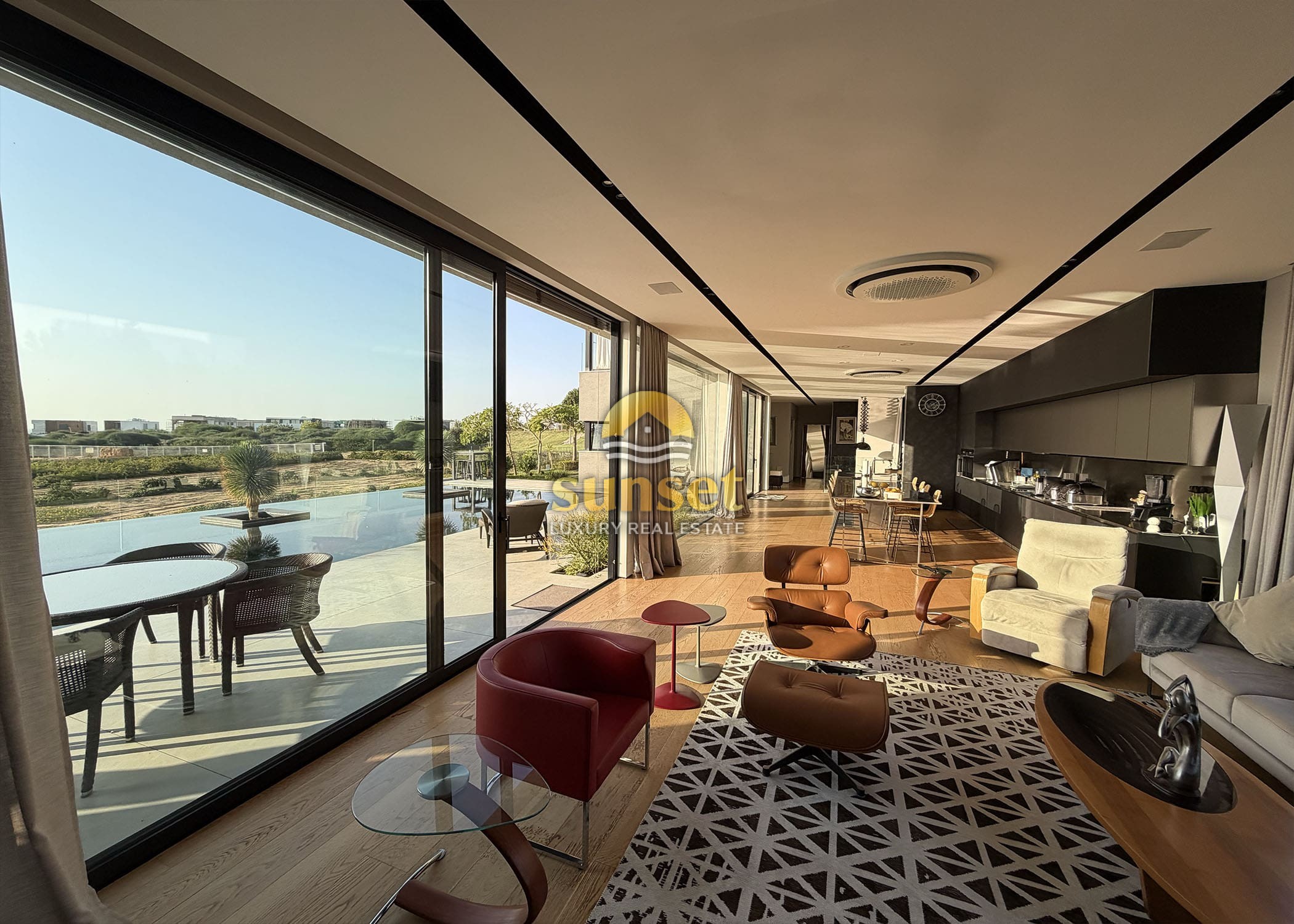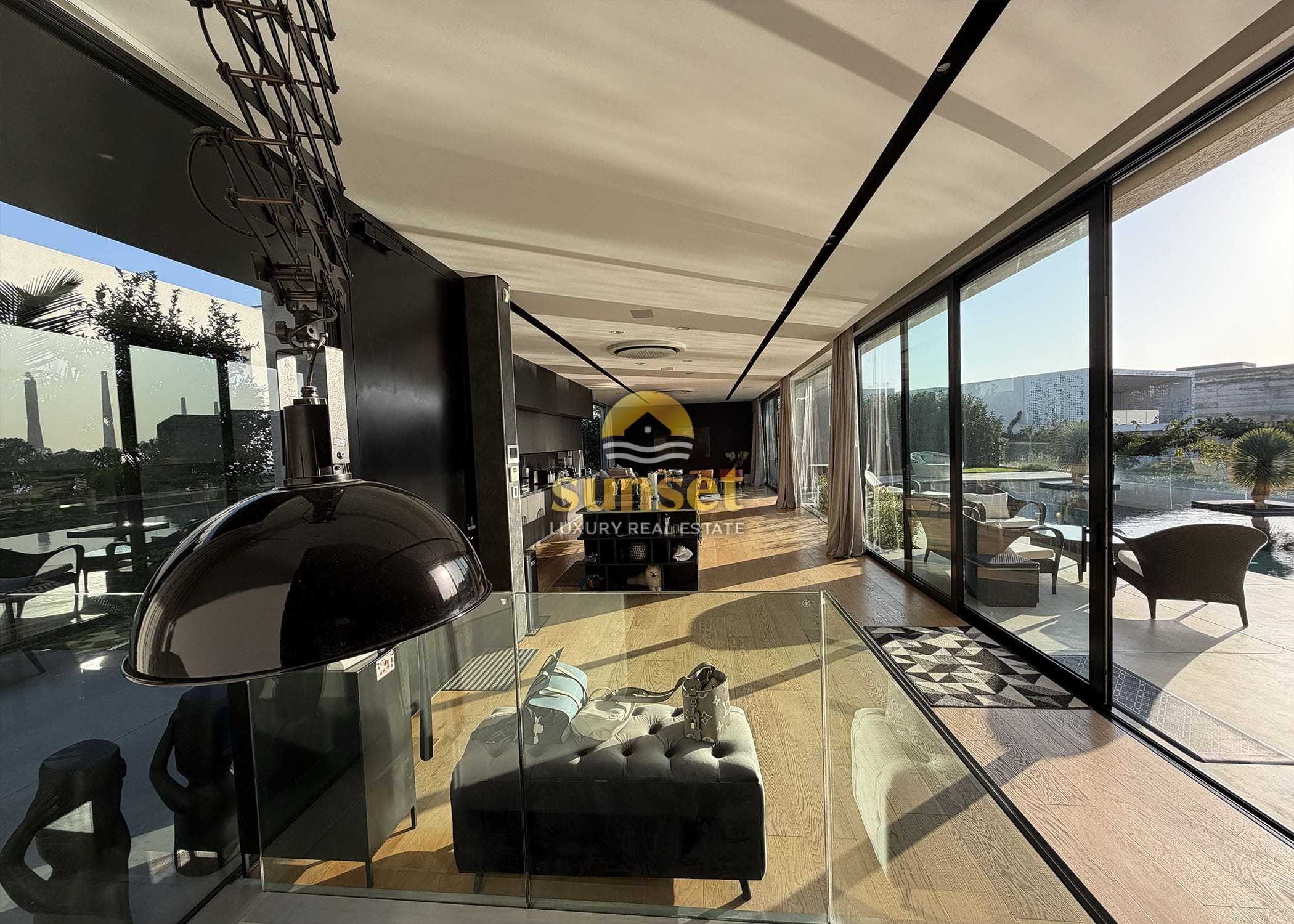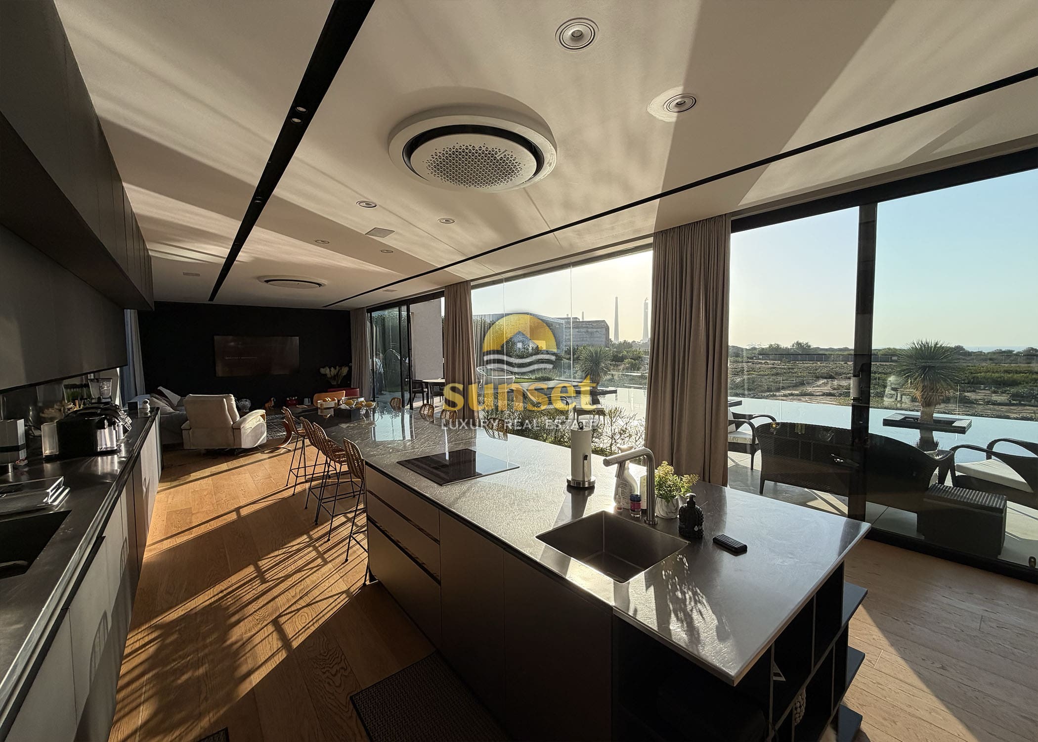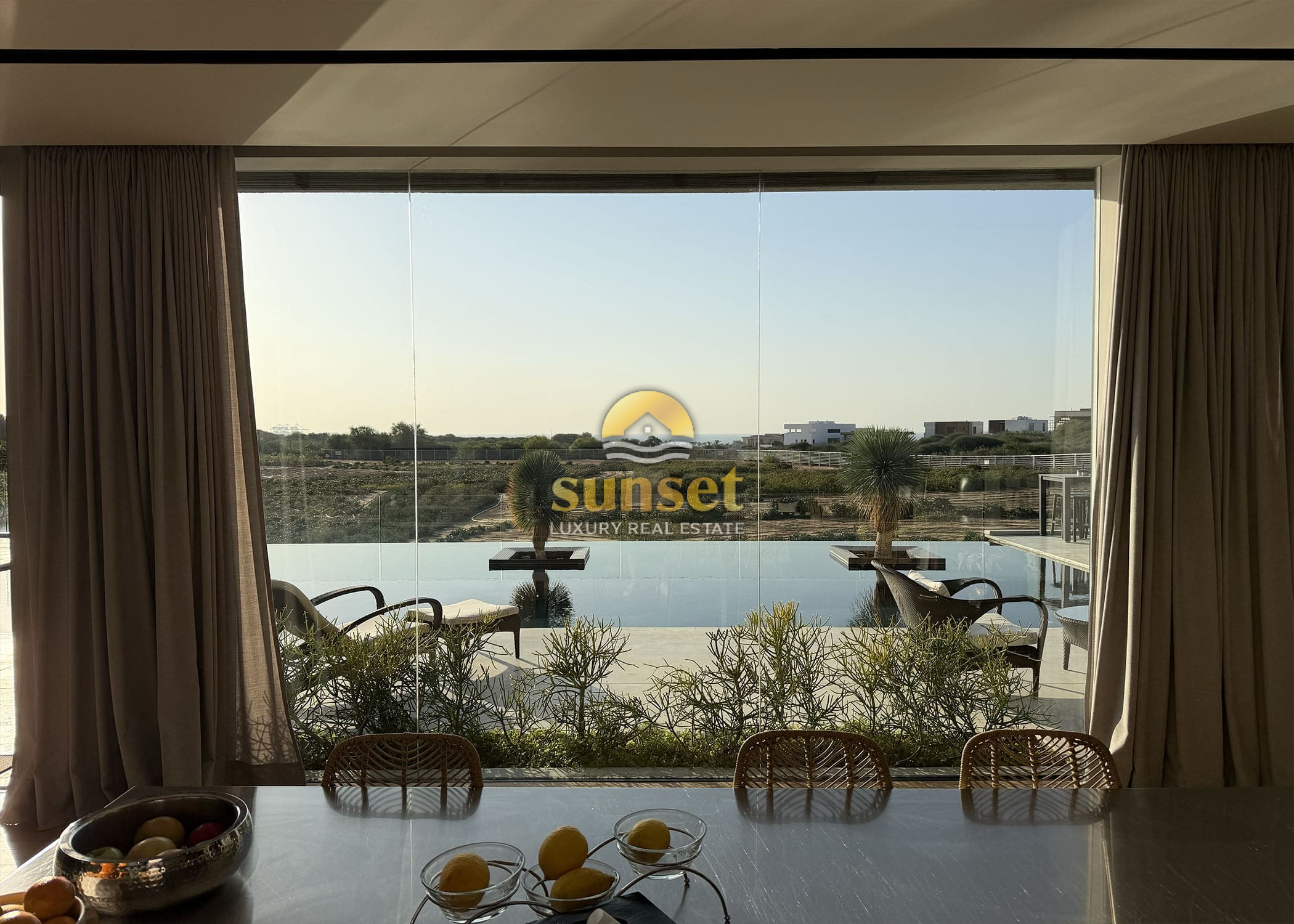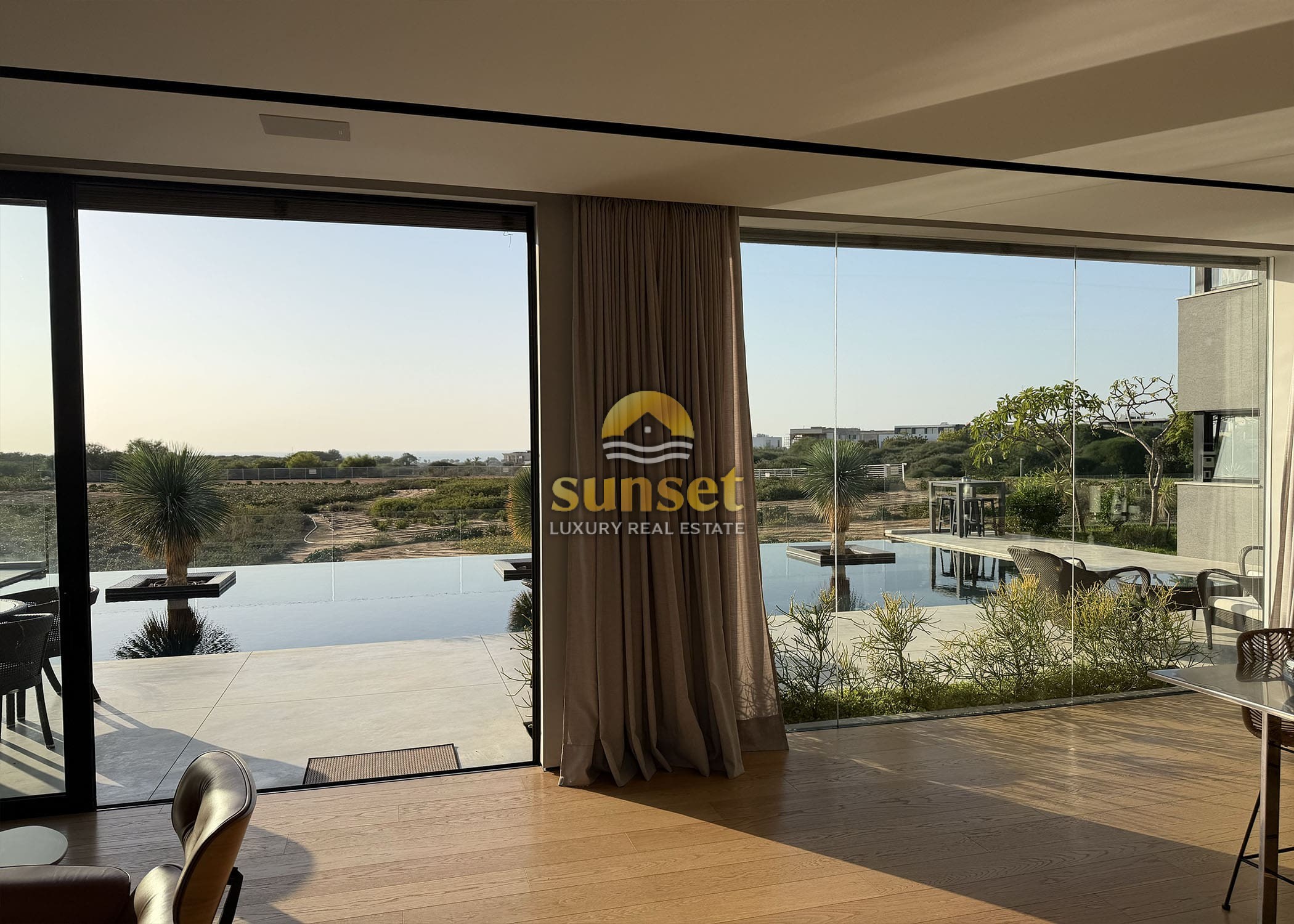 The moment you enter the villa, your eyes are drawn to a 17-meter west-facing glass wall, framing: