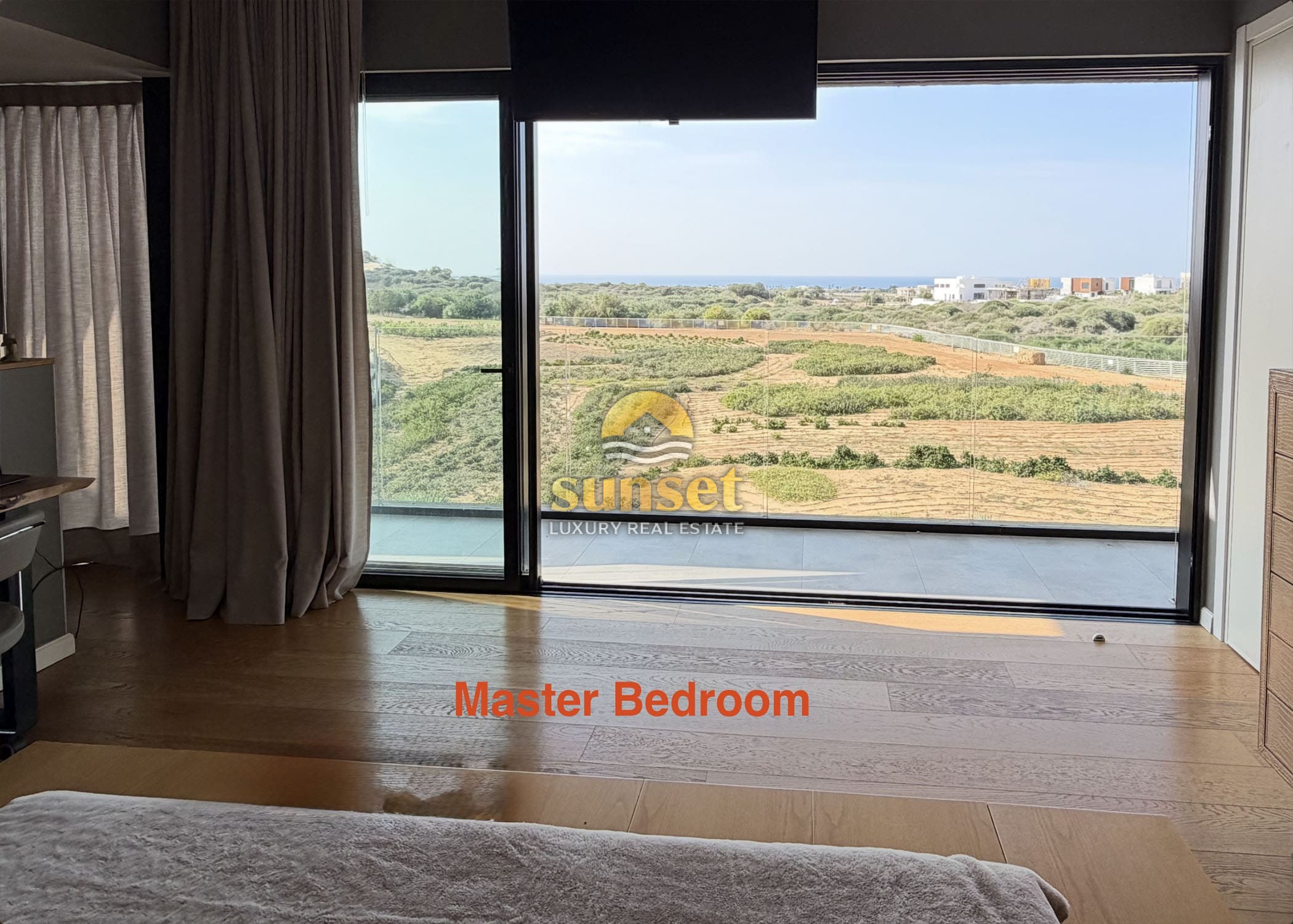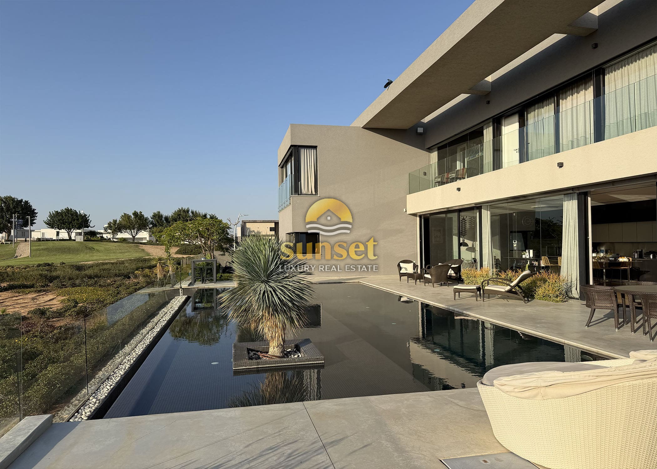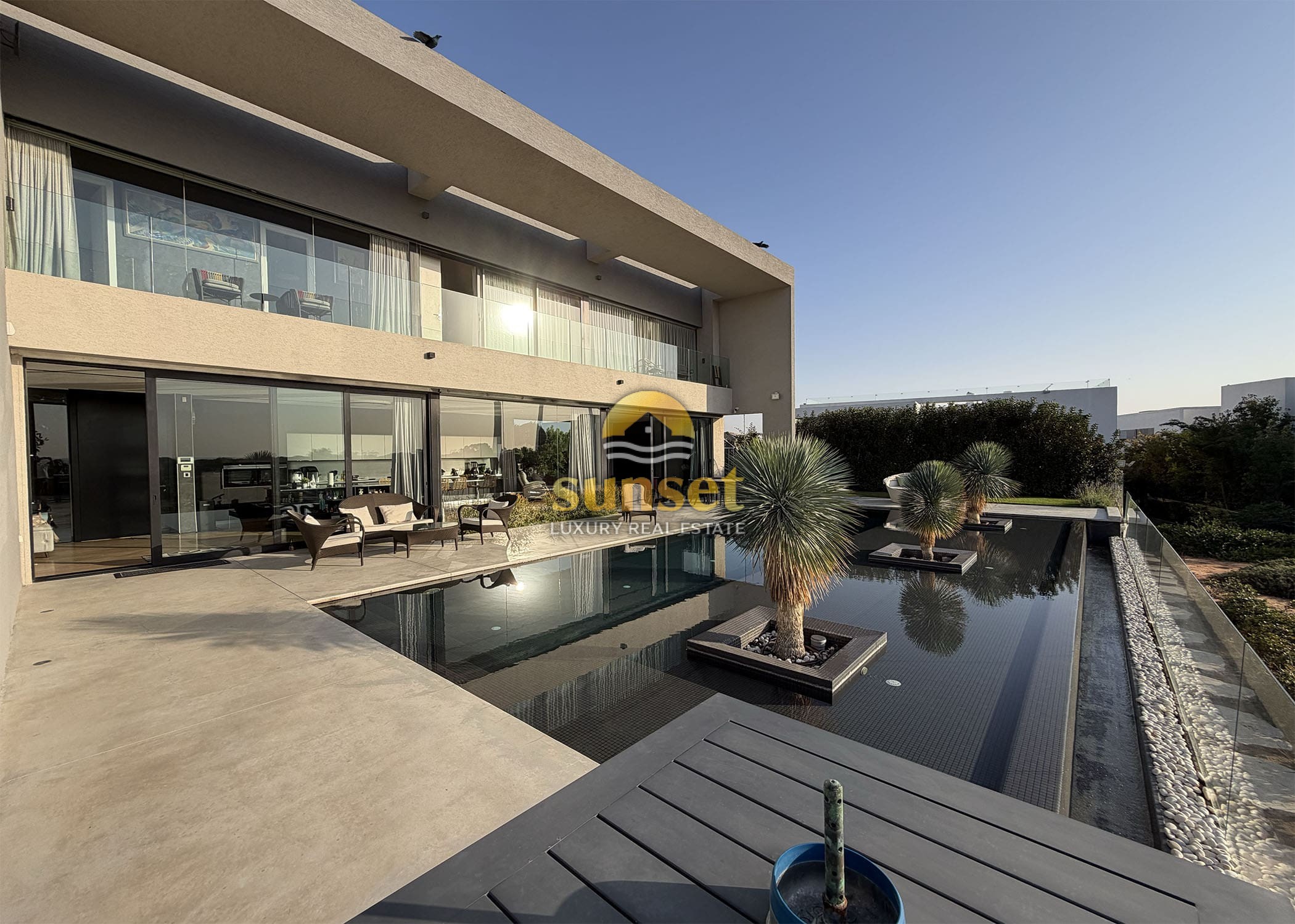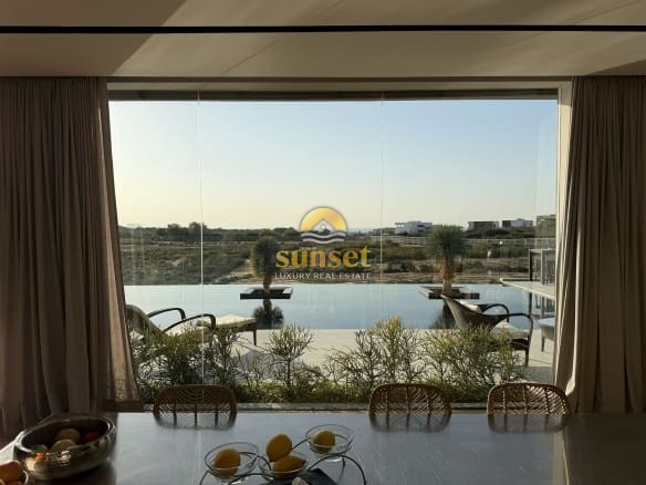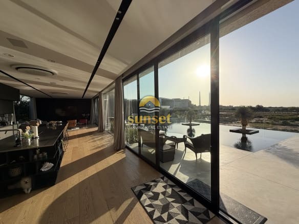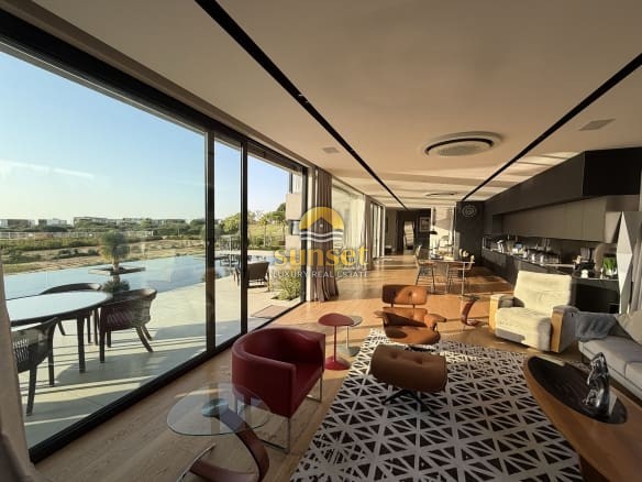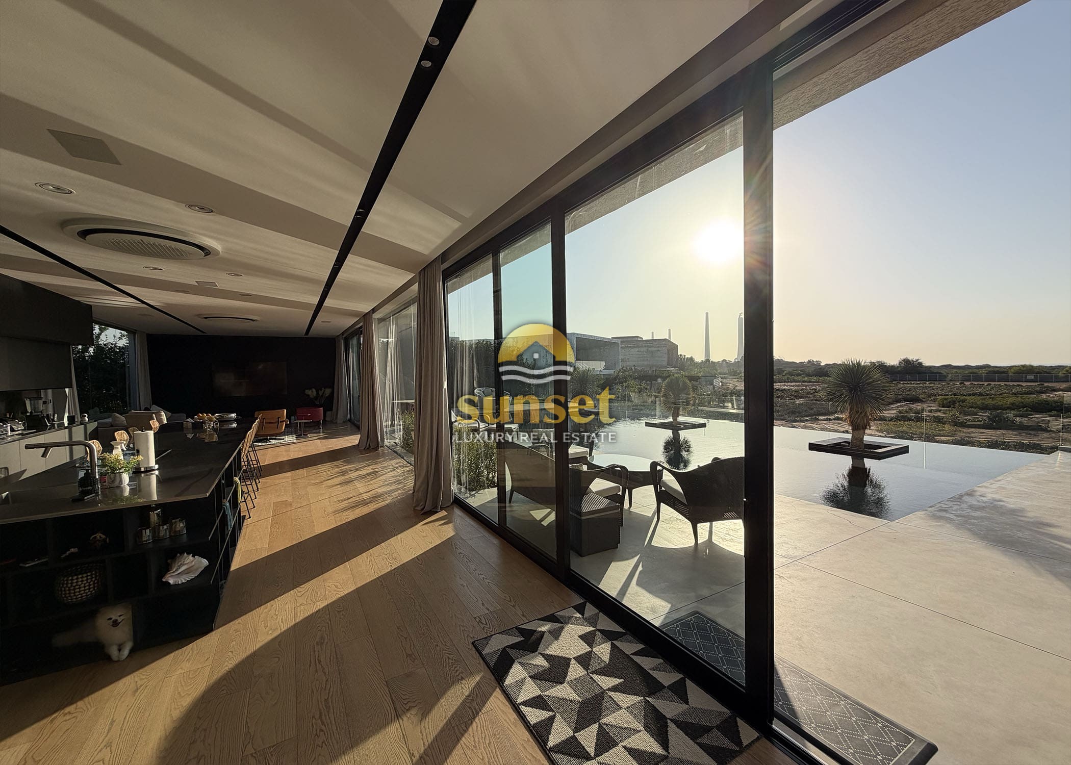 The moment you enter the villa, your eyes are drawn to a 17-meter west-facing glass wall, framing: